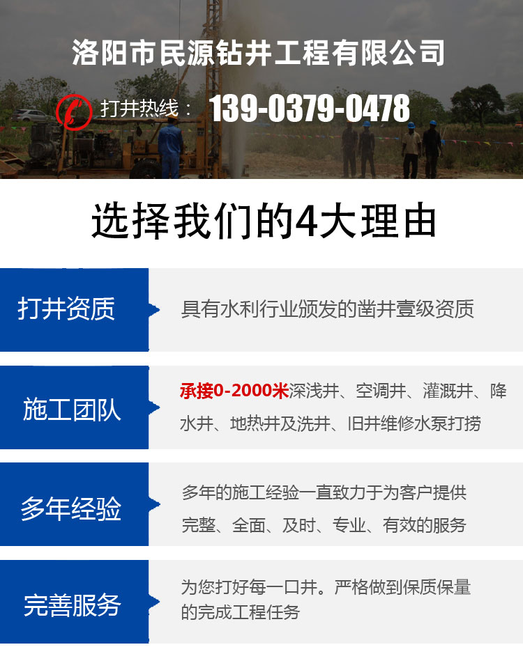 洛陽市民源鉆井工程有限公司是技術(shù)過硬、經(jīng)驗(yàn)豐富的施工團(tuán)隊(duì),具有鑿井行業(yè)壹級資質(zhì)證書,擁有水鉆400、300鉆機(jī)、空壓機(jī)、打樁機(jī)、潛孔錘十余臺;適用于農(nóng)家打井、農(nóng)田打井、機(jī)關(guān)單位打井、企業(yè)廠家打井、以及各種工程工地打井。